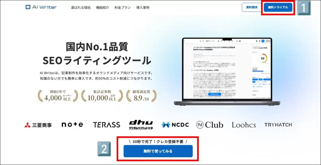 1. 右上の「無料トライアル」1️⃣ または中央下にある「無料で使ってみる」2️⃣ をクリックします。