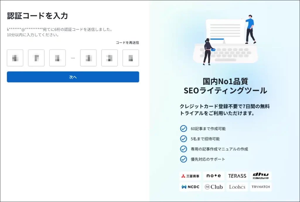登録したメールアドレス宛に認証コード(6桁の数字)が送られてきますので、そのコードを入力し「次へ」をクリックします。