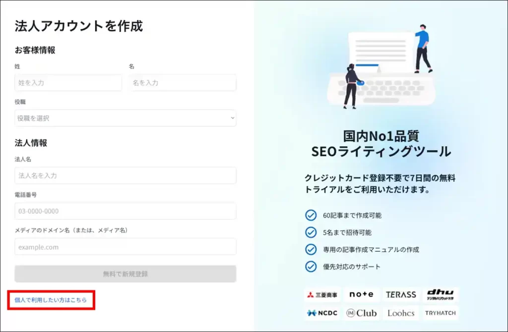1. 法人アカウント作成画面になりますので、法人の方はそのまま項目に入力、個人の方は最下部にある「個人で利用したい方はこちら」をクリックします。