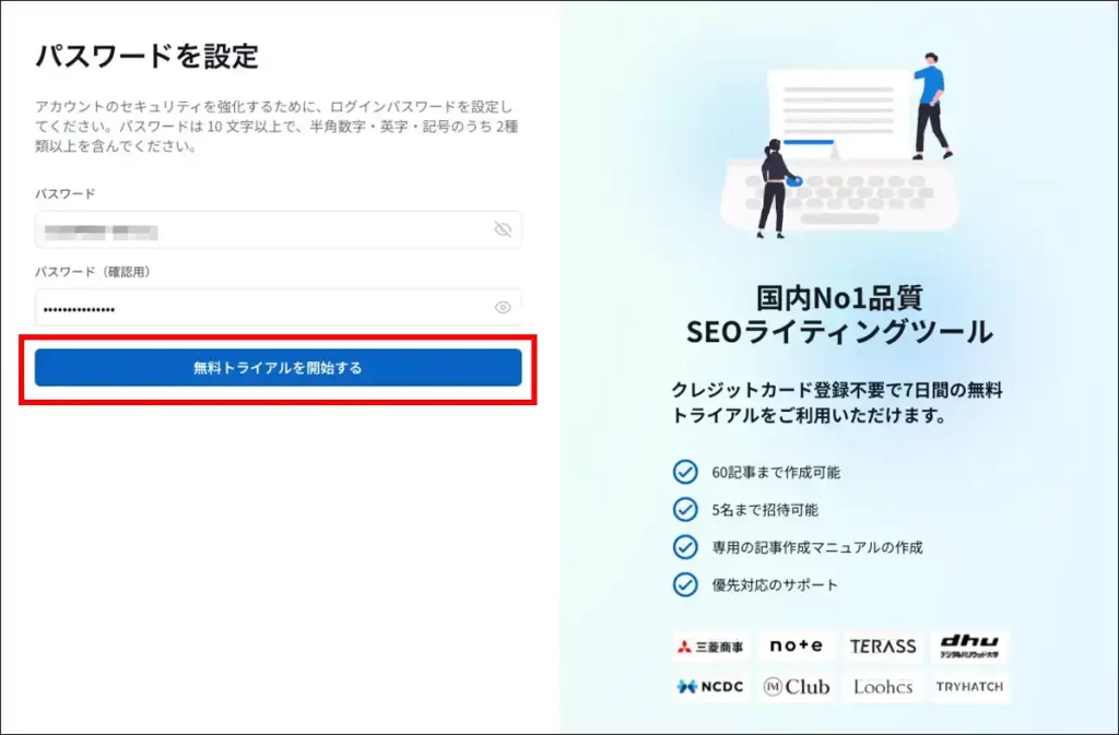 1. 最後にパスワードを設定して「無料トライアルを開始する」をクリックします。