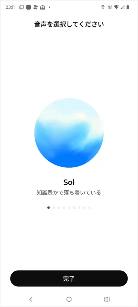 1. 音声を選択(初回のみ): 初めて音声会話機能を使う際、AIが話す声のタイプを選ぶ画面が表示されます。好みの声を選択し、「完了」をタップします。