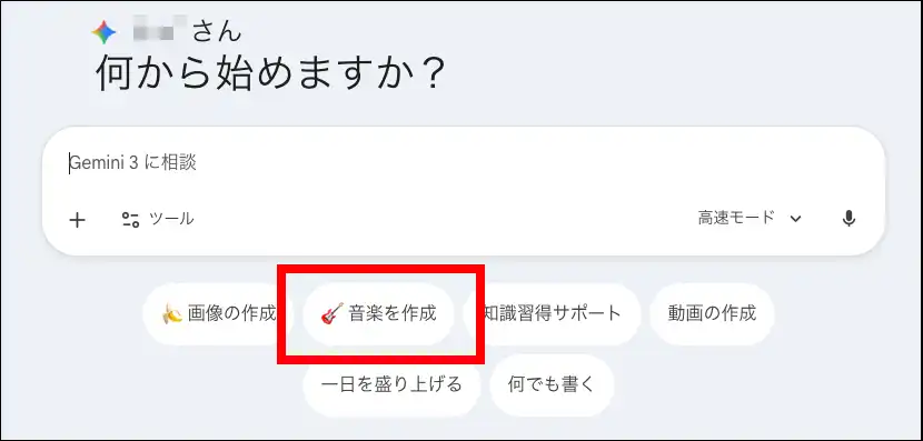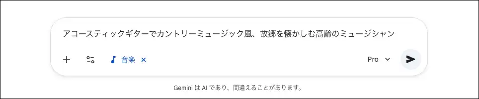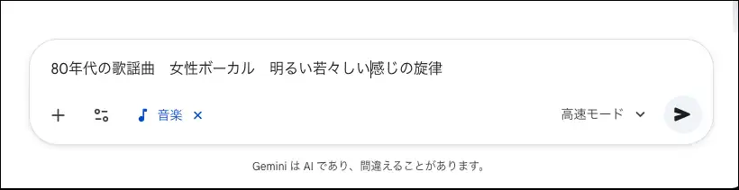 ワンポイント: もしメニューに見当たらない場合は、直接チャット欄に「音楽を作って」と入力するだけでも、Geminiが「どんな曲にしますか?」と聞き返してくれますよ。