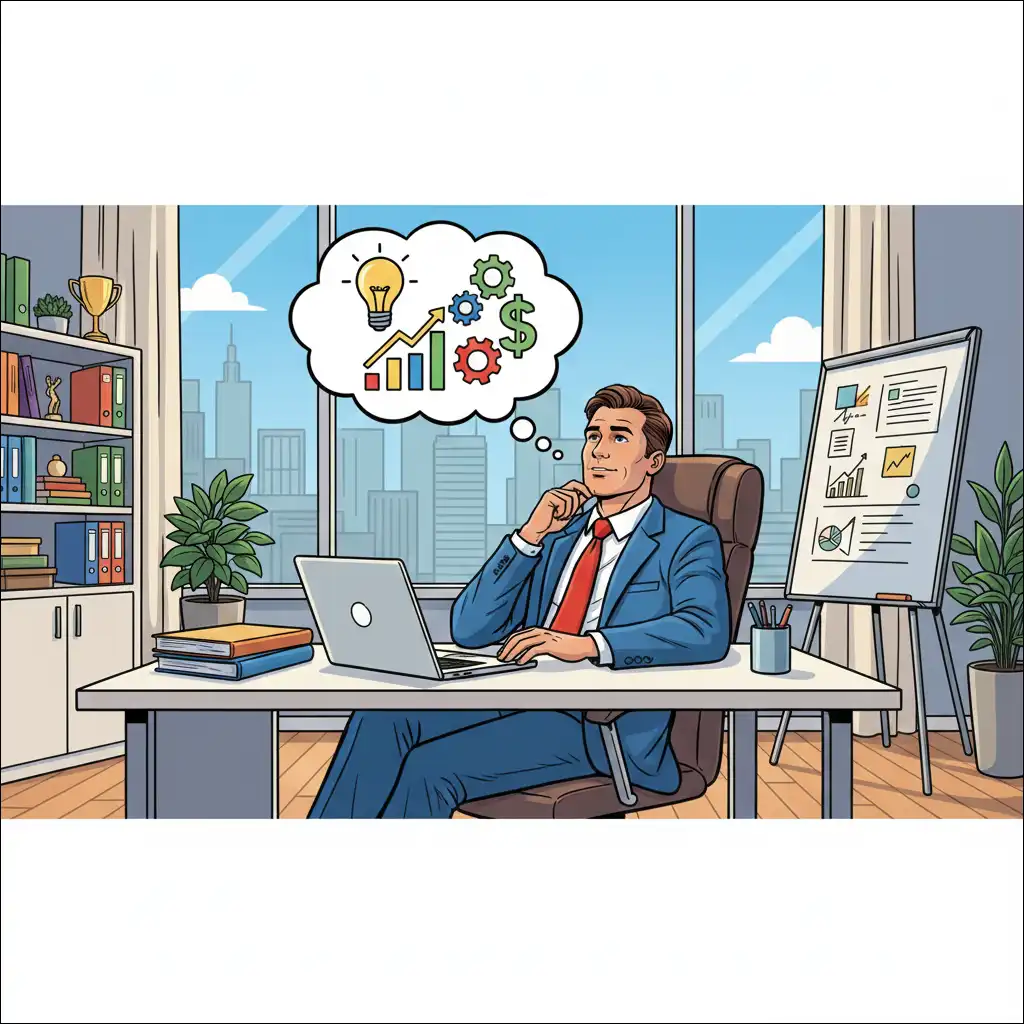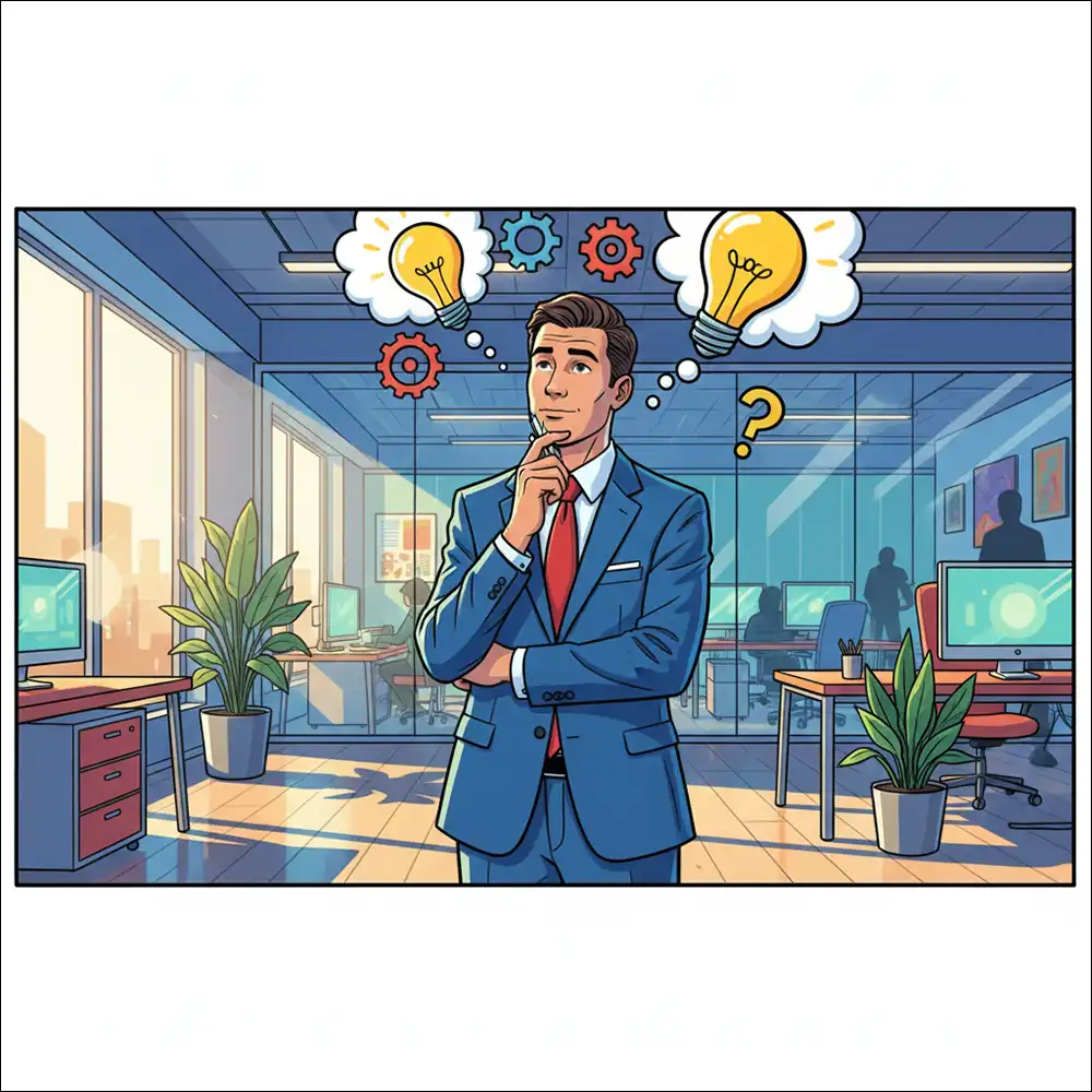 ※日本語:16:9のイラストを生成します(厳密)。 明るいアメリカンコミックスタイル。 鮮やかな色彩、大胆な輪郭。 シーン:オフィスで考え事をするビジネスマン。