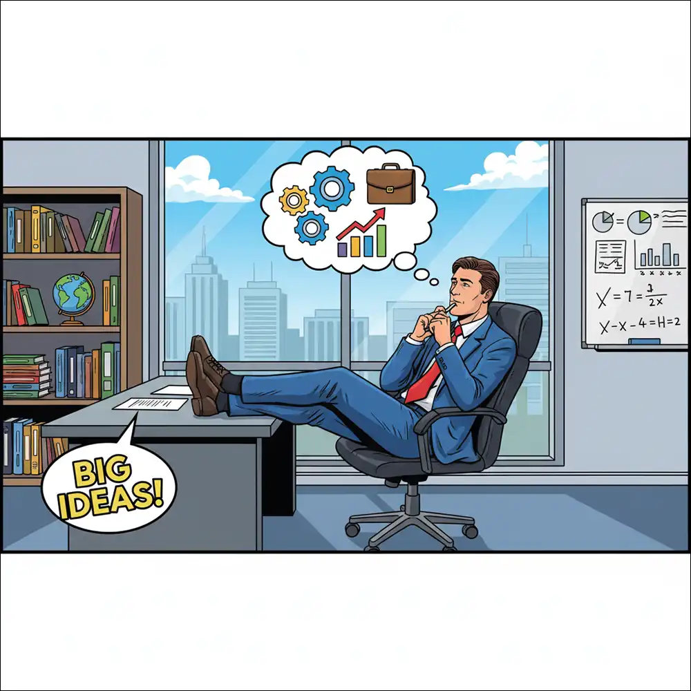 明るいアメリカンコミックスタイル。 鮮やかな色彩、大胆な輪郭。 シーン:オフィスで考え事をするビジネスマンのイメージ画像を作成してください。